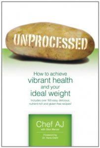 Chef AJ generously provided me with a signed copy of her book Unprocessed as a giveaway. To enter the giveaway simple leave a comment at the end of this post about either of the following topics. One entry per comment, so you have LOTS of chances to win…enter as many times as you’d like.