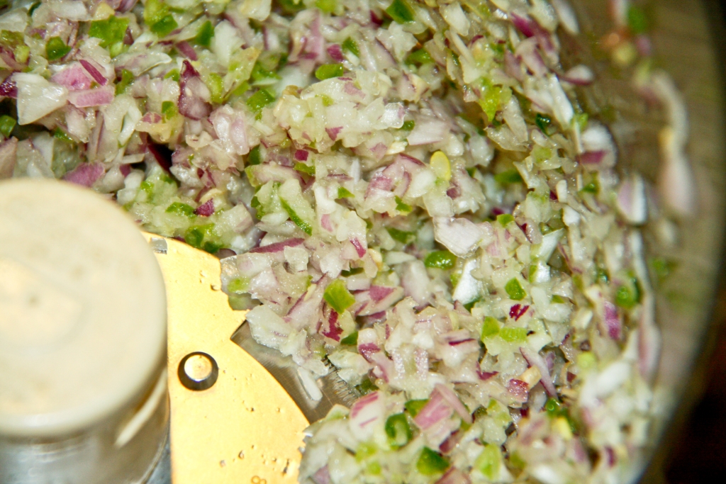 I like to place a flat black trash bag on my counter in order to avoid chicken juice flying everywhere (and it makes the clean-up a snap). I also pound the chicken inside a produce bag from the grocery store for the same reason. As for how the rest of the prep goes…I’ll tell it in pictures.
